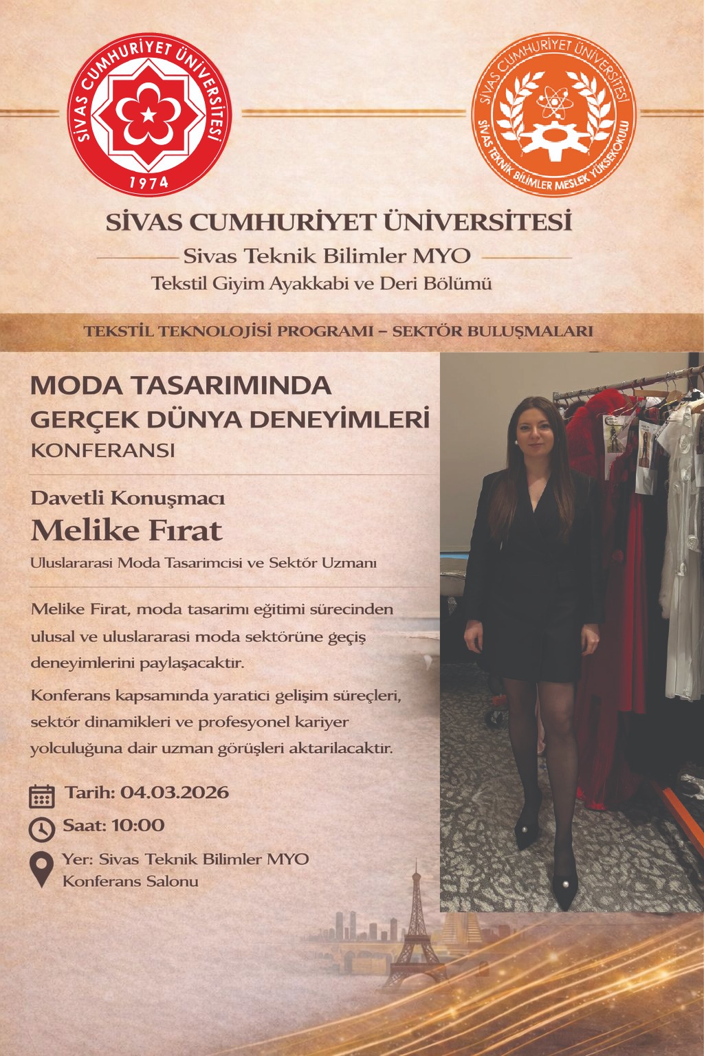 Yüksekokulumuz Tekstil Giyim Ayakkabı ve Deri Bölümü Tekstil Teknolojisi Programı tarafından Tekstil Teknolojisi – Sektör Buluşmaları kapsamında Uluslararası Moda Tasarımcıcı ve Sektör Uzmanı Melike Fırat “Moda Tasarımında Gerçek Dünya Deneyimleri” konulu konferans düzenlendi. Çevrim içi olarak gerçekleştirilen etkinlikte sektör uzmanı, moda tasarımı eğitiminden uluslararası moda sektörüne uzanan kariyer yolculuğu ve sektör deneyimlerini öğrencilerle paylaştı.